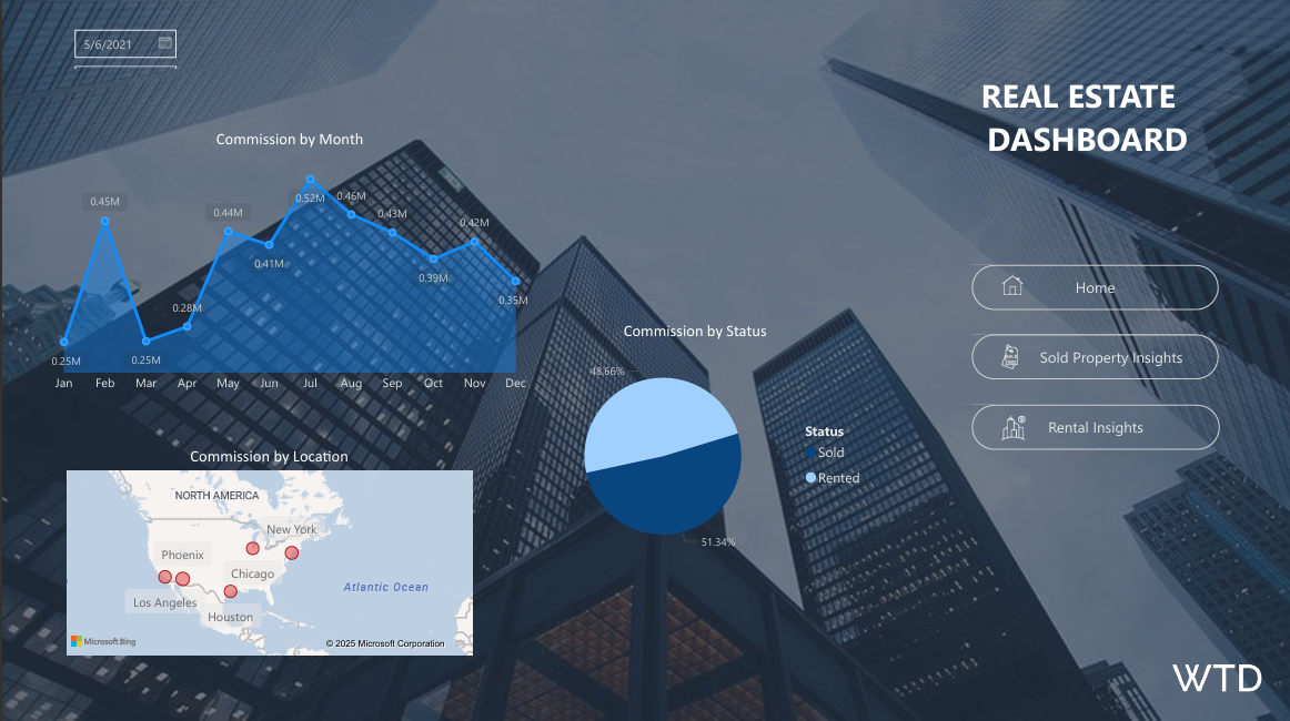 The Real Estate Dashboard offers comprehensive insights into property transactions, including metrics such as monthly commissions, rental vs. sold ratios, and geographic performance.